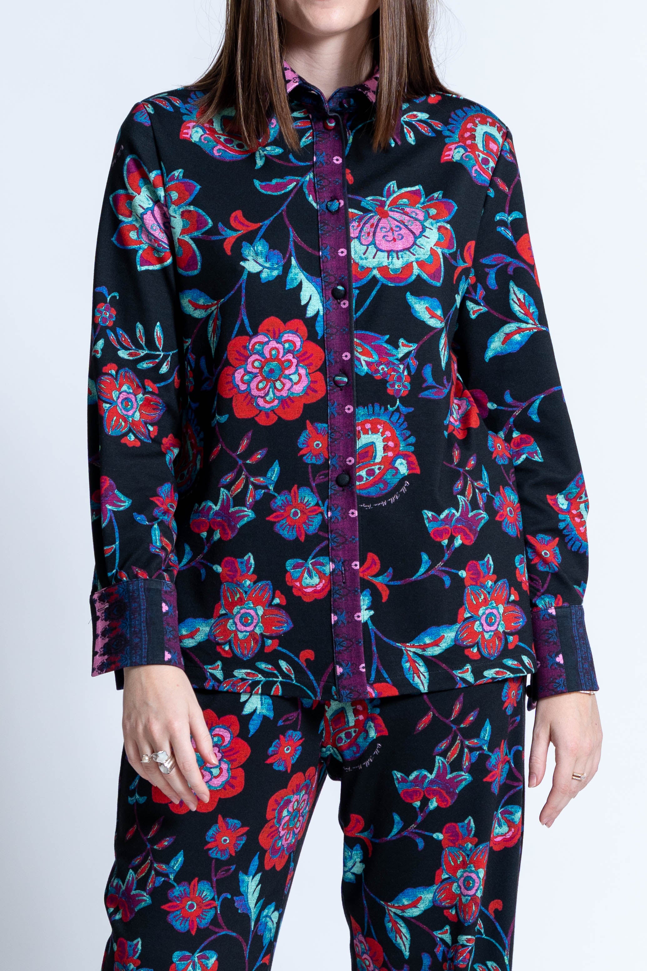 Camicia con stampa a fiori stilizzati rosa con colletto e cannolé con decorazione a greca negli stessi colori.