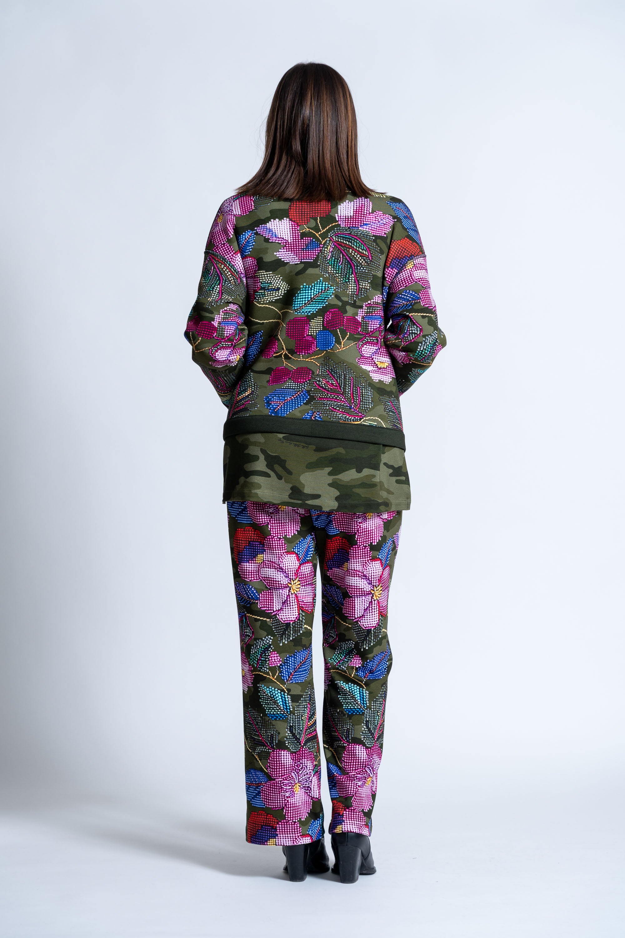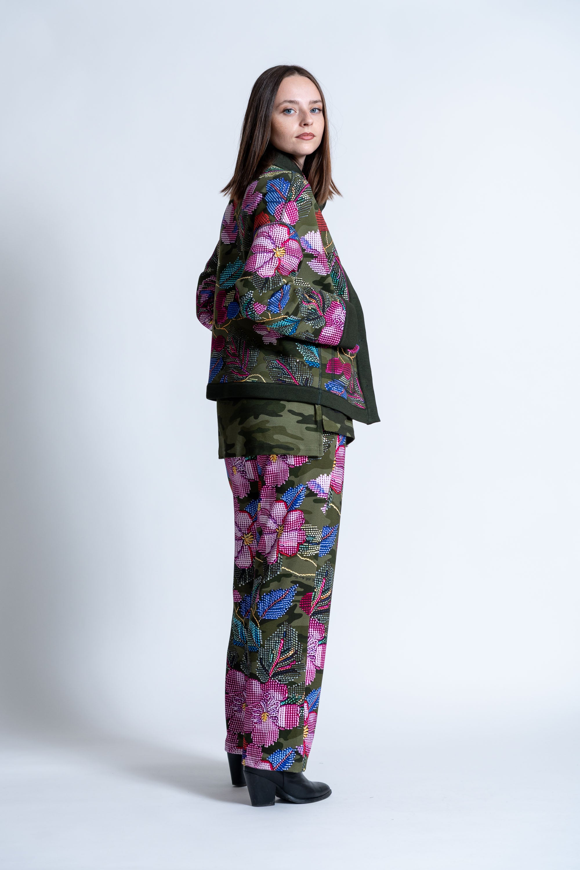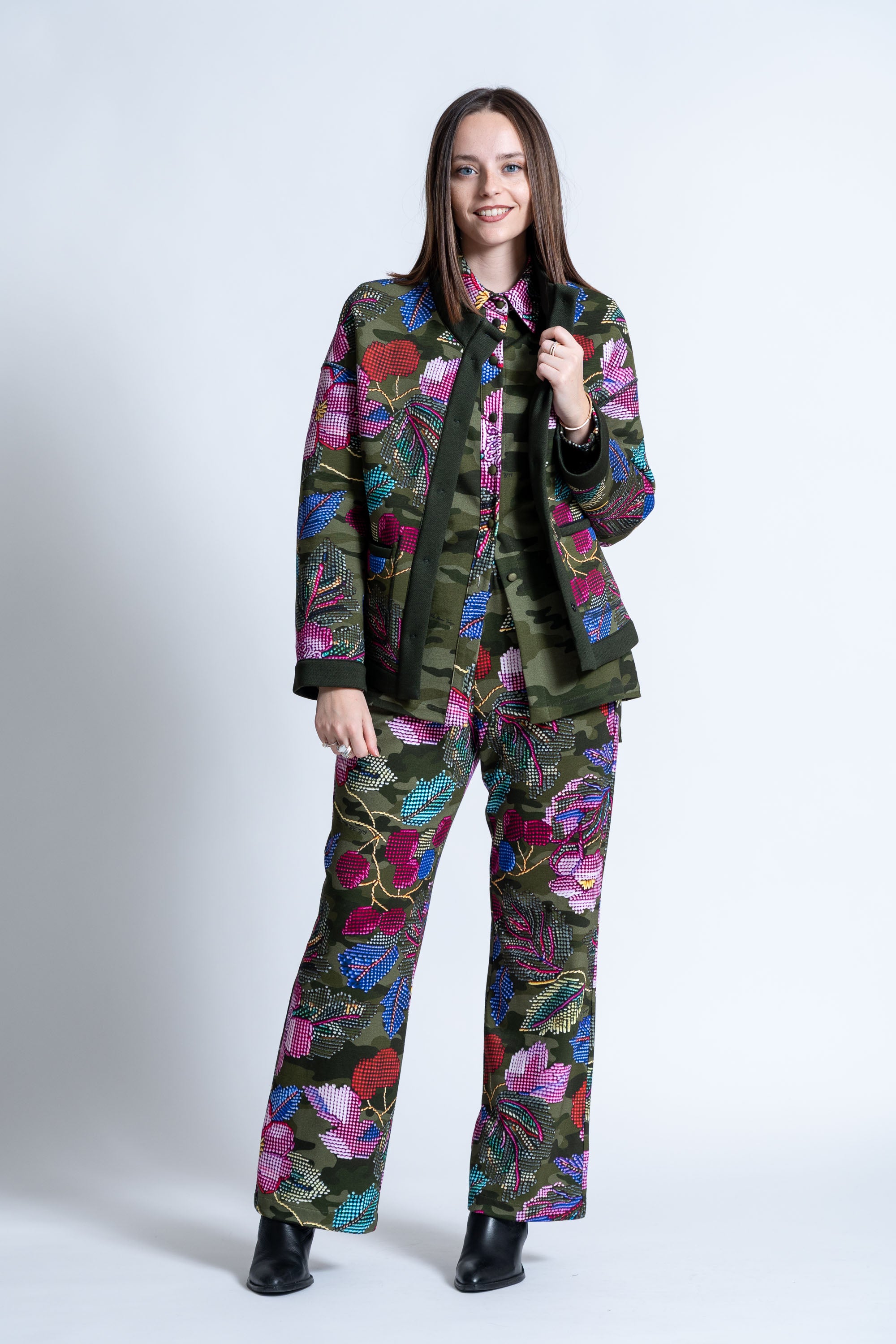 Il motivo nasce dal dialogo tra una base mimetica sofisticata e una stampa floreale che richiama la delicatezza del ricamo, creando un effetto materico e tridimensionale di straordinaria eleganza.