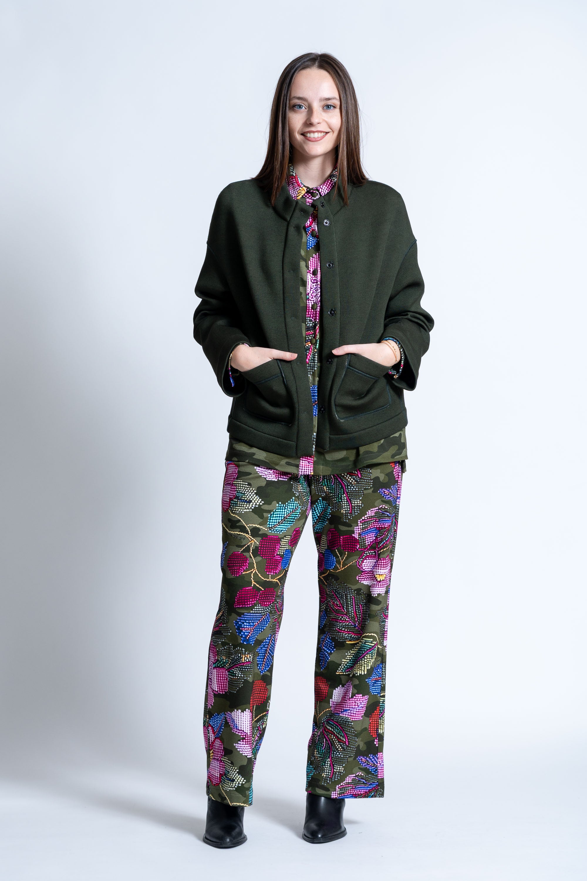 Giacca reversibile: su base mimetica, è impreziosita da applicazioni floreali con effetto ricamo, mentre l interno unito verde militare ne esalta il carattere artigianale e il design pulito.